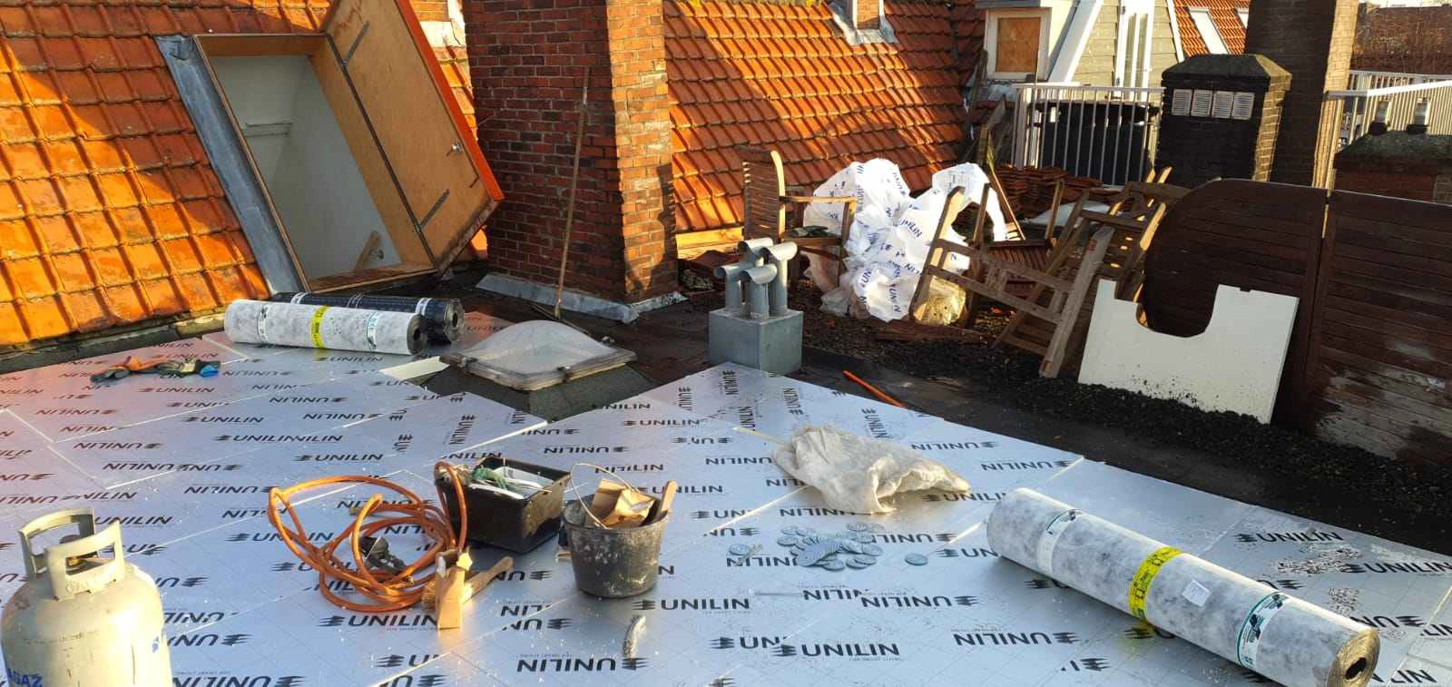 Bij een koud plat dak wordt het plat dak geïsoleerd aan de binnenkant van de draagconstructie. Bij de isolatie wordt deze geplaatst langs de waterwerende laag. Deze wordt niet opgewarmd door warmte van de woning. Dit is de reden waarom we dit een koud platdak noemen. Deze manier van dakbedekken gebruiken we vooral bij bestaande platte daken en aanbouwen met een beperkte hoogte. Maar een koud dak is niet altijd aan te raden vanwege temperatuurverschillen, waardoor er scheuren kunnen ontstaan. Een warm dak is een betere methode, want deze isoleert de draagconstructie wel. Daardoor zal de constructie minder uitzetten en is er minder kans op schade aan de dakbedekking. Bovendien houdt de constructie de warmte vast. Daarvoor maken we gebruik van A-materiaal, zoals bijvoorbeeld XPS-platen of PIR-platen. We kunnen je helpen in het maken van de juiste keuze. Het uitvoeren van deze werkzaamheden is namelijk lastig om zelf te doen. Anders kun je zelfs lekkage krijgen. Doe dit daarom niet zelf, maar neem gerust contact met ons op om een offerte aan te vragen.